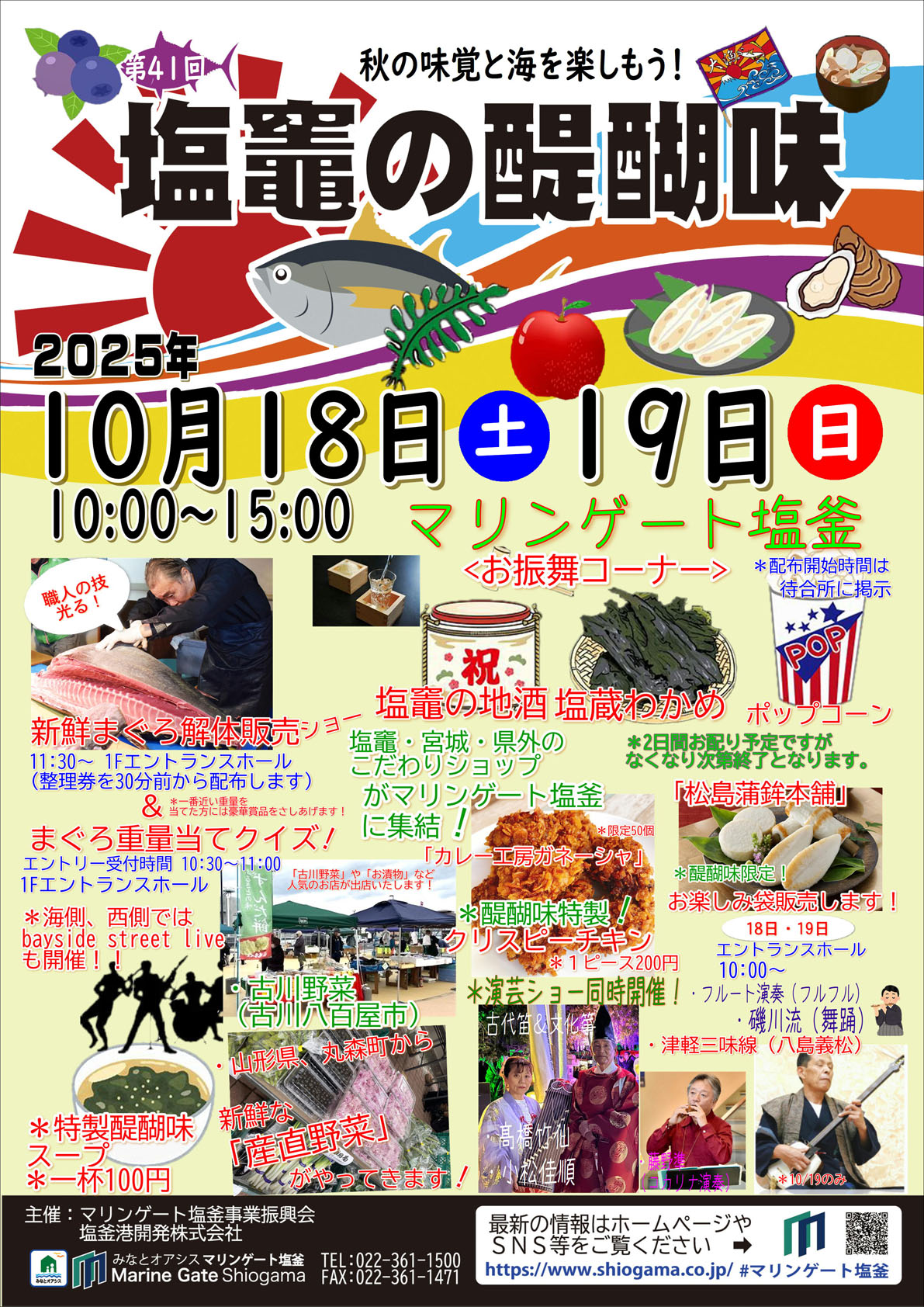![]() ![]() 2025年10月18日(土)・19日(日) 第41回塩竈の醍醐味 ![]() 2025年12月13日(土) 塩竈の街角から音楽プロジェクト クリスマスライプ |