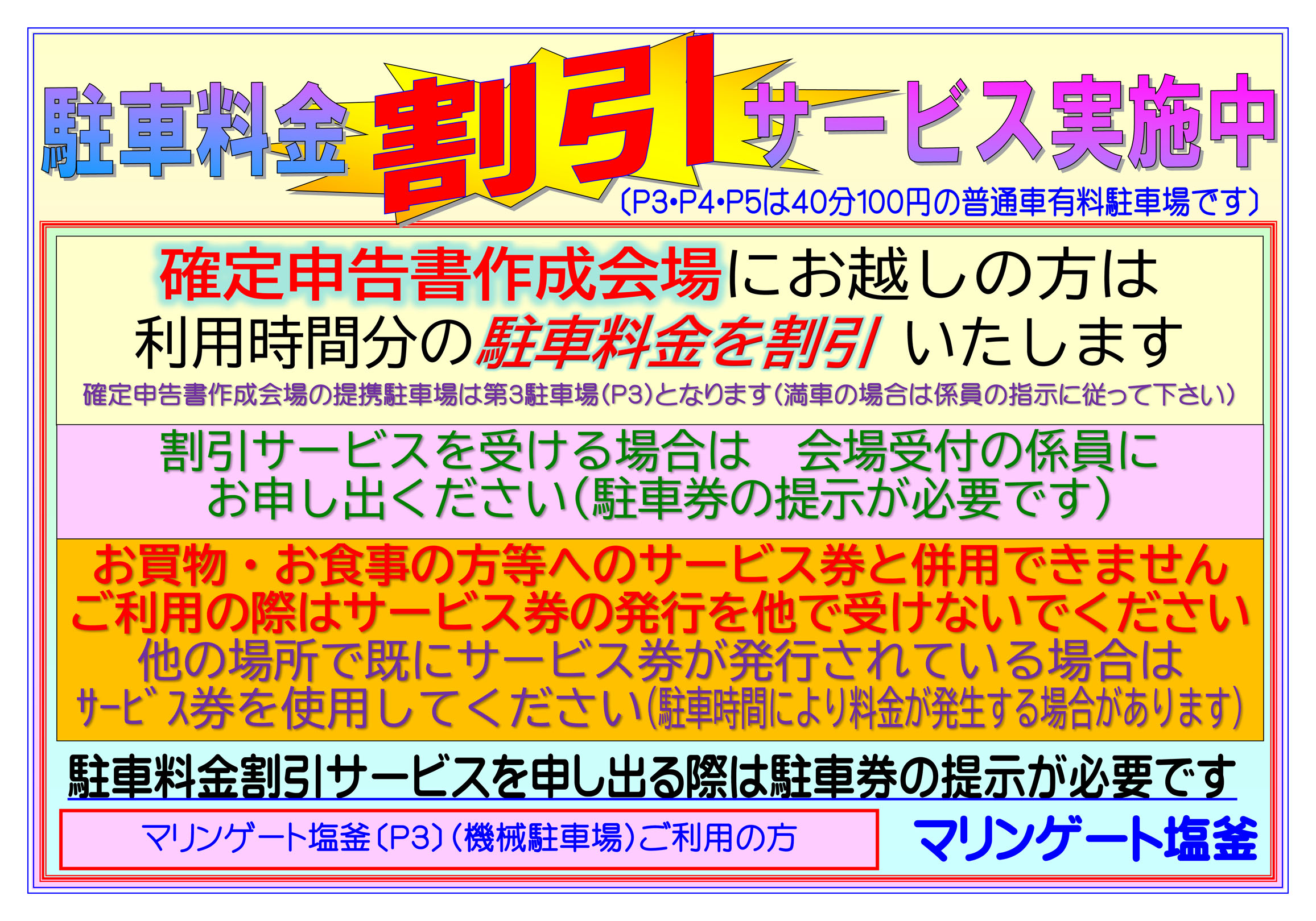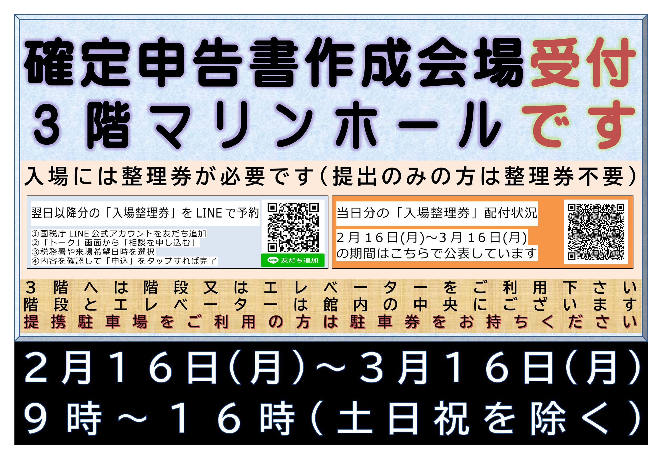 ![]() ![]() 2026年2月16日(月)〜3月16日(月)まで 塩釜税務署管轄(塩竈市・多賀城市・宮城郡)の 令和7年分確定申告期における 確定申告書作成会場が館内に開設されます。 (土日祝を除く9時〜16時) 作成会場への入場には予約が必要です。 前日までの予約(LINE)もしくは、 当日予約(先着順)が必要です。 提出のみの場合は予約は不要とのことです。 |